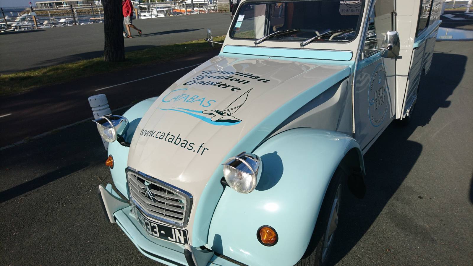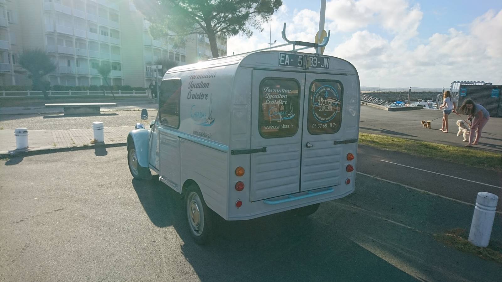 location bateau Arcachon a choisi de restaurer et de mettre aux couleurs de la société une magnifique 2CV fourgonnette AK 400 de 1971.